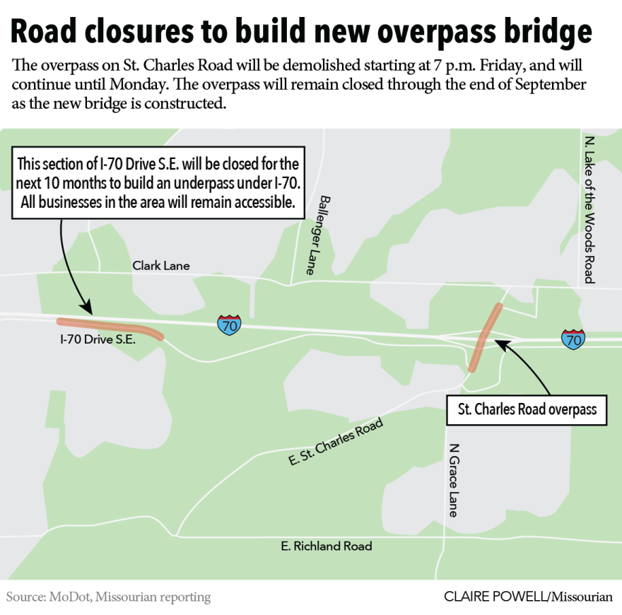 The demolition process is expected to last from Friday to Monday. Traffic on St. Charles Road will not have direct access to or from I-70 and will be rerouted to avoid construction. A segment of I-70 Drive S.E. has been closed since March 23 and will remain closed for an anticipated 10 months.